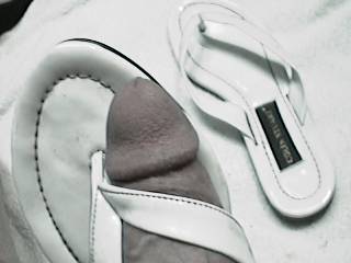 Her shoe was filled with my hot jism! I squeezed some out of my cock and onto her white sandals and worked it in really good by rubbing it in with my cock. I then had to actually pour my load out of her clog. I wiped it semi-clean, because I wanted her to wear them with my cum still inside, and my cum dried onto the sole of her sexy well worn sandals.
