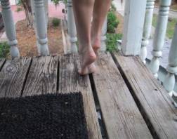 Rachel greeted the movers on her porch and introduced herself. She instantly noticed that both men glared at her feet as the climbed the stairs. She had been barefoot all day long and the bottoms of her feet were slightly dirty. She felt embarrassed about her dirty feet. She turned around and led the workers into her house. As she did, the movers both watched her feet as she walked inside. They broke their stares only to look at one another, smile, and then direct their attention back to her beautiful feet.