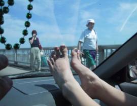 Anytime they passed a car, Rachel had to take her shoes off and put her feet on the dash and up against the windshield. They figured they might be able to attract a third or forth guy to have fun with her too.