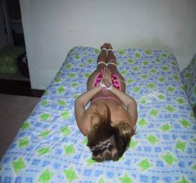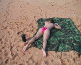 Once on the beach, Rachel was ordered to set up her stuff and lay out on her tummy. They positioned her right next to a huge group of guys. They sat hidden from them and watched her go over there alone and lay out her beach things. One of the men even came over and offered to put lotion on her. She had to let him and the men noticed how the strange man even managed to massage the oil into her feet!